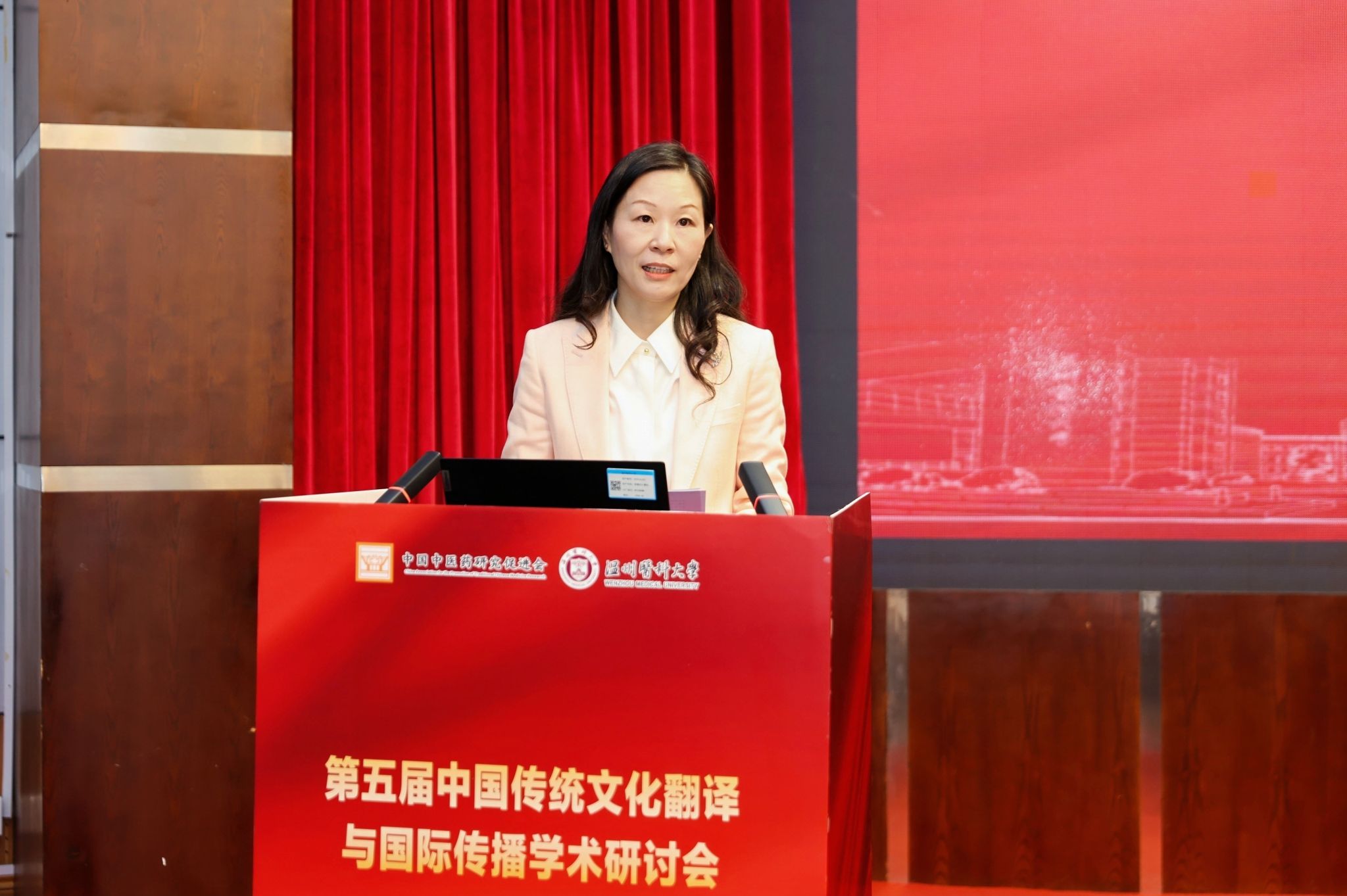朱雪波副校长在致欢迎辞中对远道而来的嘉宾表示热烈欢迎,向长期关心支持学校发展的中国中医药研究促进会及各界朋友致以诚挚感谢。她表示,党的二十届四中全会作出了“激发全民族文化创新创造活力,繁荣发展社会主义文化”的重要部署,明确要求“提升中华文明传播力影响力”。在人工智能迅猛发展的大背景下,本次研讨会聚焦“文化翻译的标准化与数字化”,共同探讨中医药文化翻译与国际传播议题,正是顺应时代需求、破解传播壁垒的关键举措。她期待各位专家学者畅所欲言、相互启发,共同探索AI时代传统文化翻译与国际传播的新路径、新模式,促进我国传统文化翻译与国际传播领域发展。