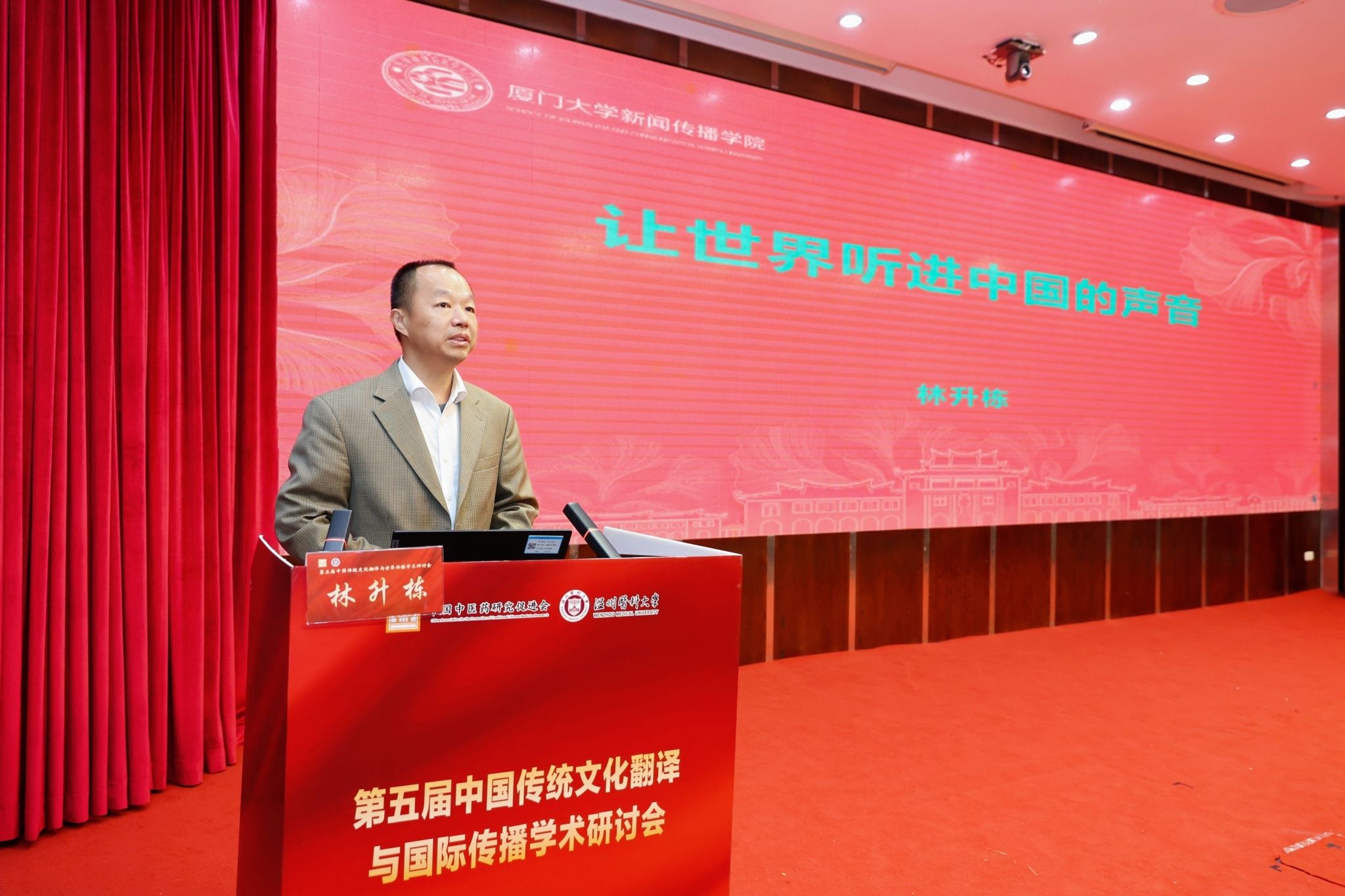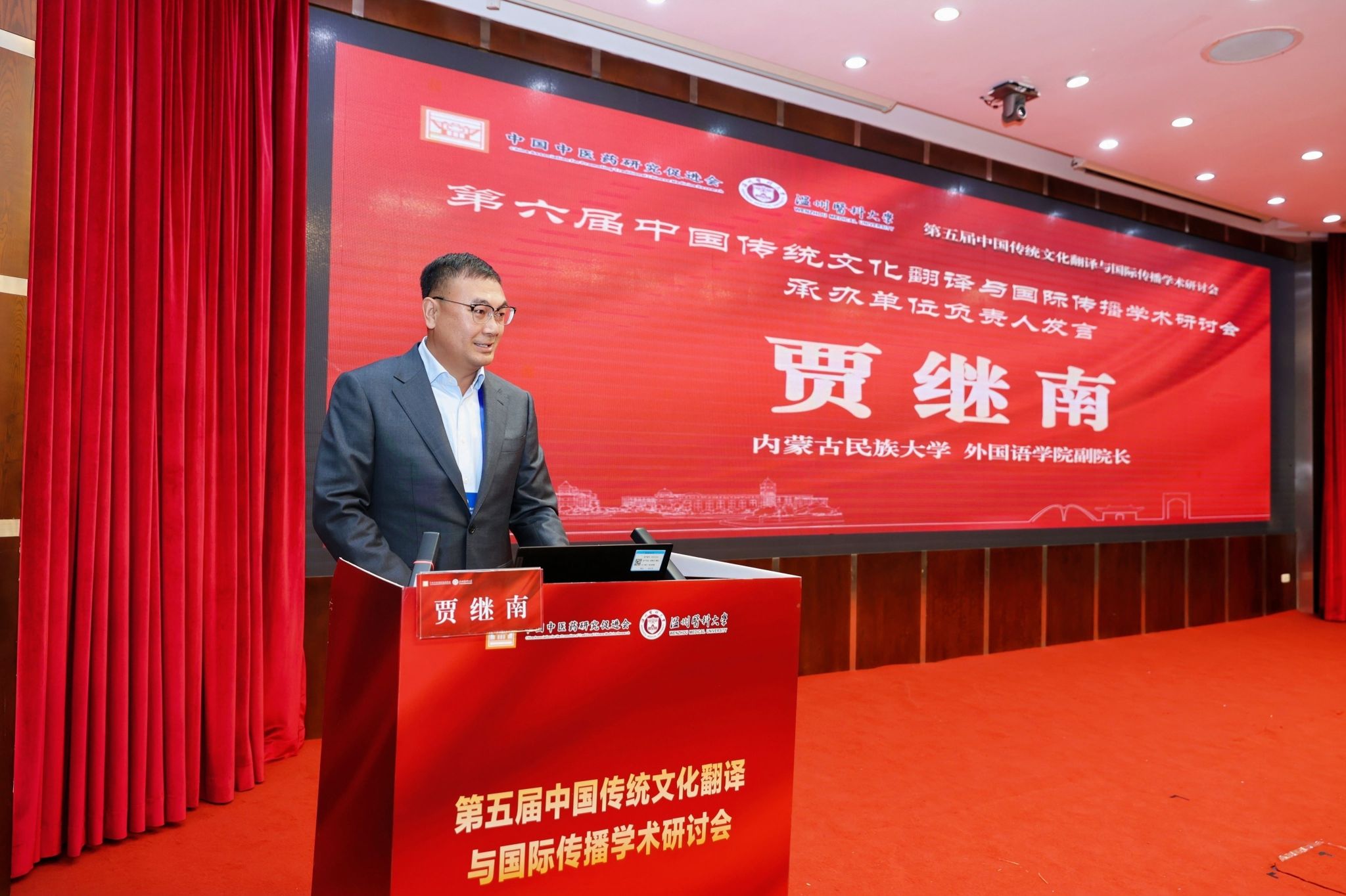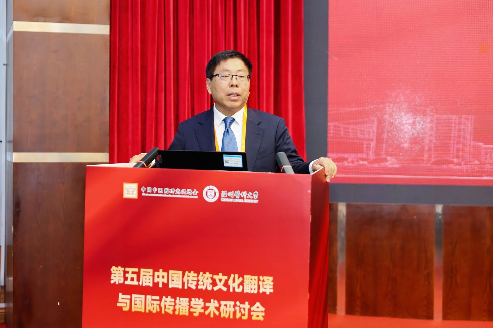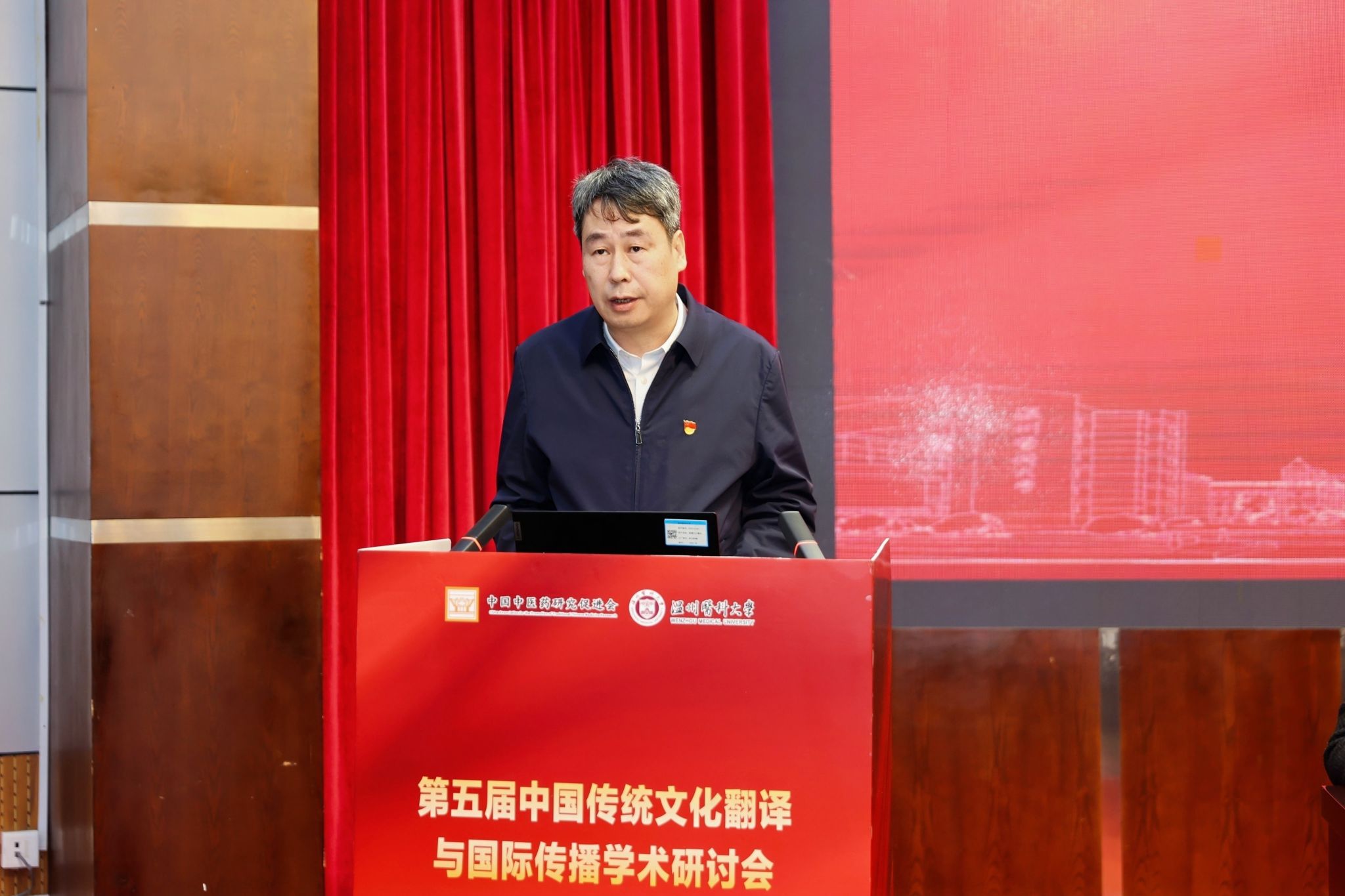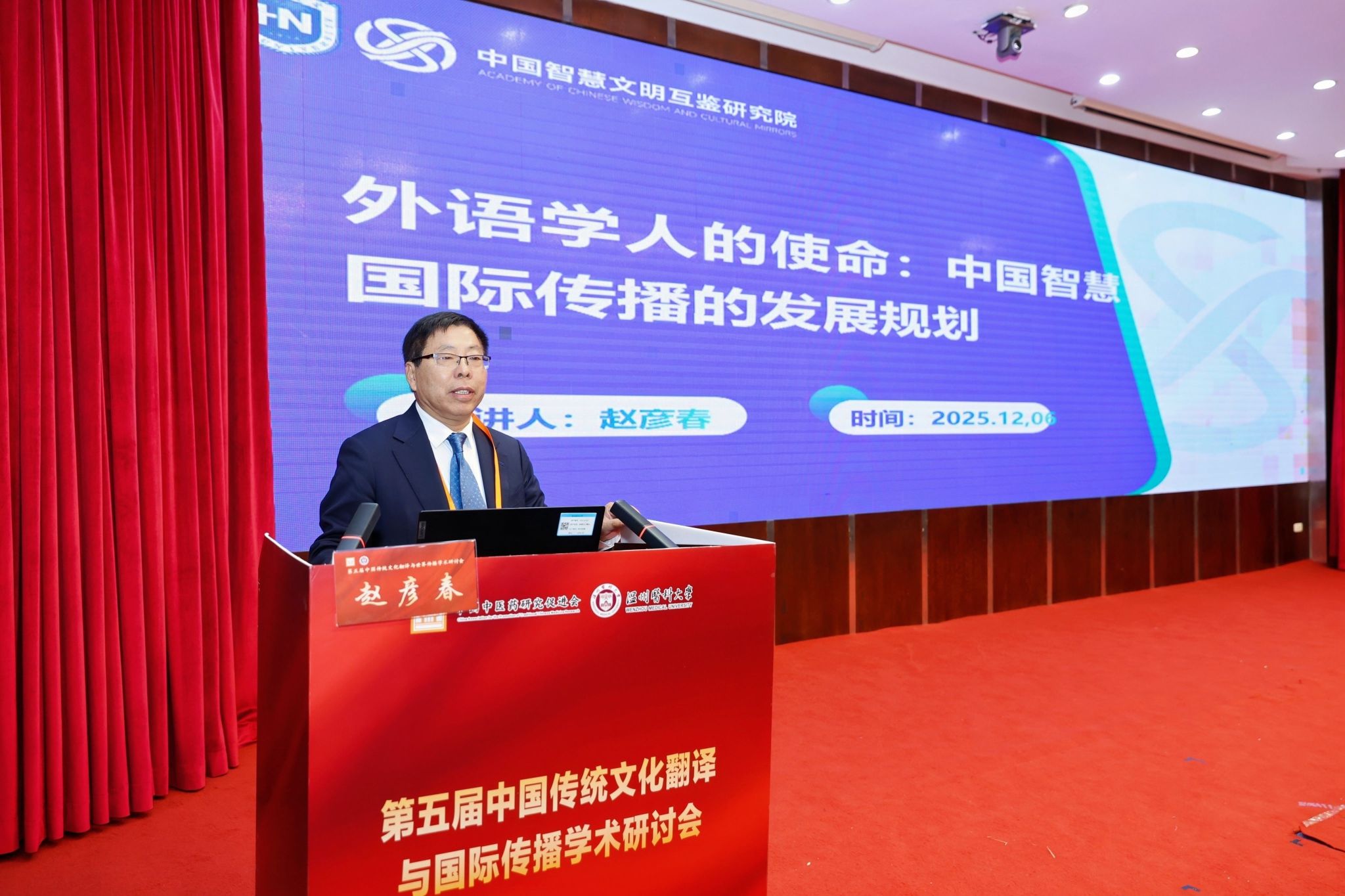 传统文化翻译与国际传播专业委员会主任委员、海南大学赵彦春教授致辞,强调参会者肩负服务国家战略的使命。他分享三点思考:一是立足国家发展形势,指出中医药文化是文化强国建设重要部分,需理清其知识体系,担当传播使命;二是明确中医药文化要踏实研究出精品、做好对外传播、推进国际合作,弥补理论与实践结合不足;三是凸显中医药追求身心愉悦的独特价值,呼吁坚守文化根脉。最后号召大家为国家昌盛、为学会发展壮大携手同行!