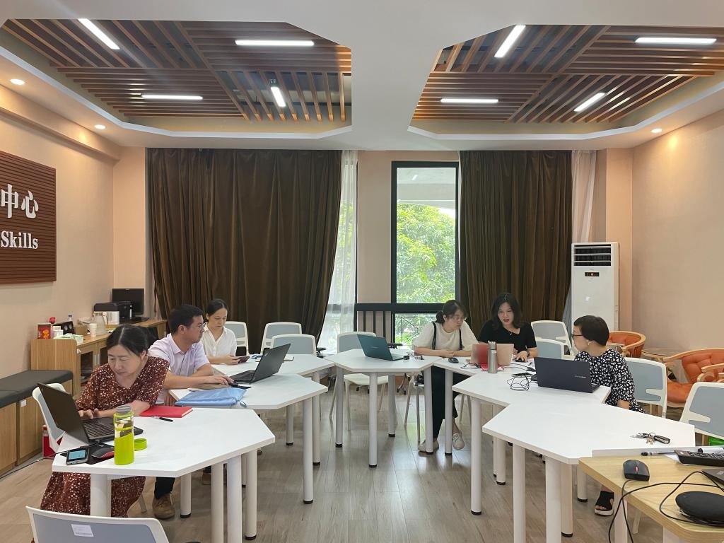 大学英语教研部以“线上+线下”相结合的方式组织开展了由外研社开发的智能测评云平台使用培训会。副院长戴建春、大学英语教研部主任章艳乐、副主任王晓丹老师及部分教研室主任在学院外语技能中心参加线下培训会,全体英语教师通过腾讯会议方式参加了本次培训。大学英语教研部第一教研室主任陈佩佩主持培训会。