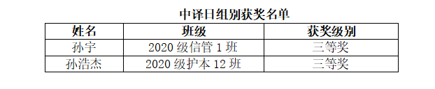 日前,2022年浙江省首届多语种思政笔译大赛顺利落下帷幕,我校2020级护本12班孙浩杰和2020级信管1班孙宇(张晓敏指导)获中译日组别三等奖。