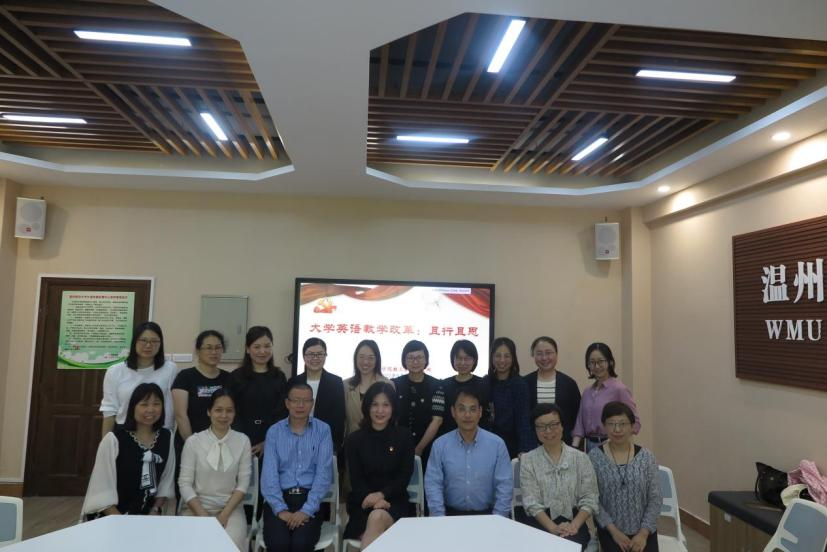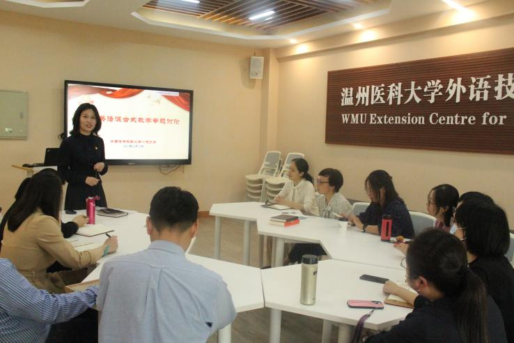 在大学英语混合式教学改革专题讨论环节,各支部成员就混合式教学的学时、线上线下比例、课程设计等方面积极发表自己的观点、分享自己对教育改革的实践体会与经验。
