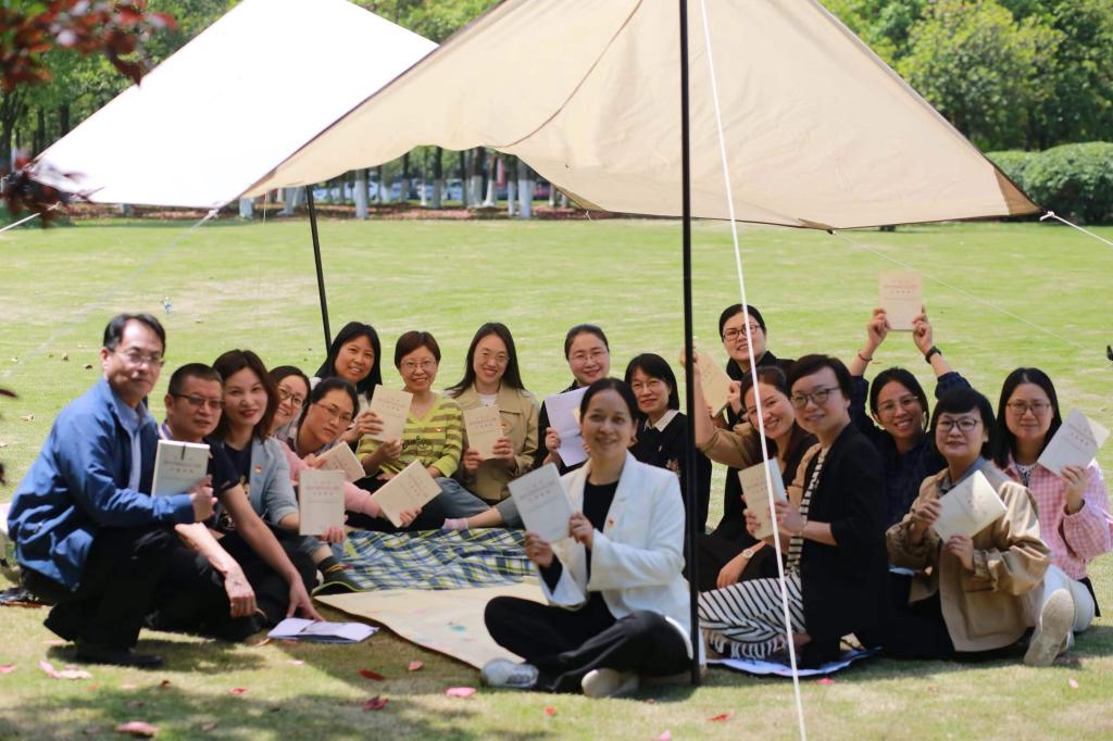 和煦微风中,大家席地而坐,聆听尹宜宜老师对二十大主题党课的讲授,饶有兴致地开展二十大知识抢答。之后,大家共同走进《摘编》世界,在诵读与交流中领略习近平新时代中国特色社会主义思想的魅力,在“乐读”、“思享”中感悟文字的厚度、理论的深度和精神的高度。
