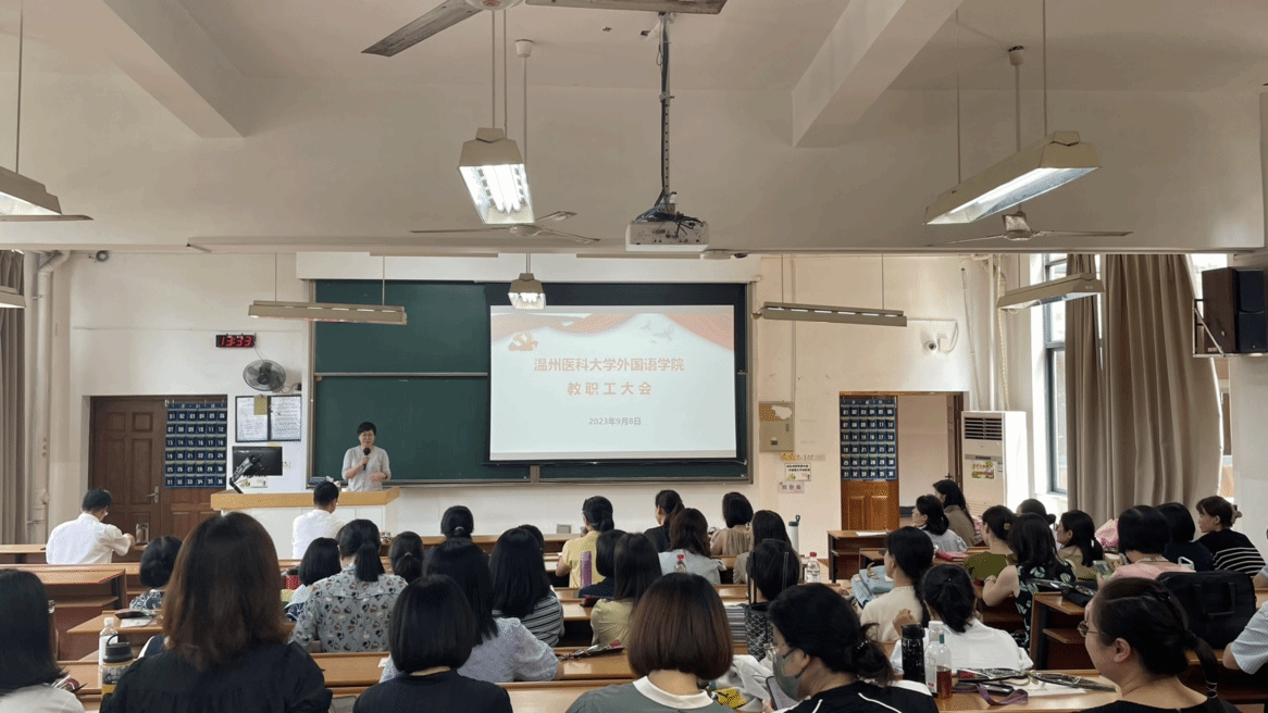 在7BJ104召开新学期教职工大会。学院领导班子、全体教职工参会,会议由党总支书记柯奔主持。
