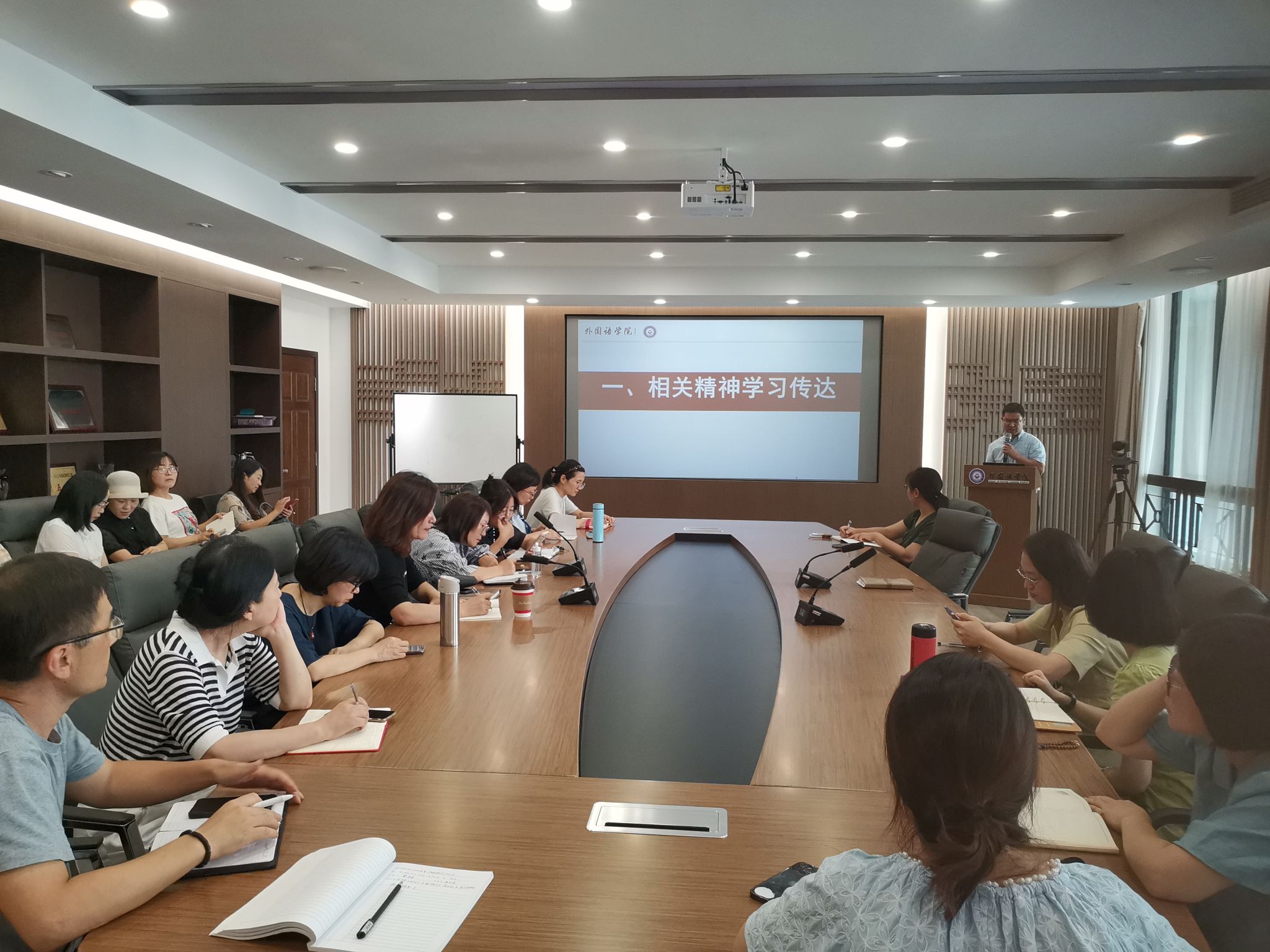 会上,戴建春副院长首先带领大家认真学习了教育部高等教育司武世兴副司长8月20日在“河北省高校‘理解当代中国’教学研讨会”上所做的主旨报告——《全面提高外语人才自主培养质量,着力造就拔尖创新人才》,并传达了学校教学工作例会精神。之后,他回顾总结了学院上学期教学工作以及取得的成绩,并对本学期的重点工作进行了部署。他强调,学院将持续推进课程建设,强化并创新课程思政,加大力度进一步提升教师素养,尤其是“三进”教学能力,认真落实“三进”教学工作任务;同时,深化教学改革,加大力度支持选修课的开设和建设,加强外语与医学专业的融合,不断推动我校外语教学高质量发展。