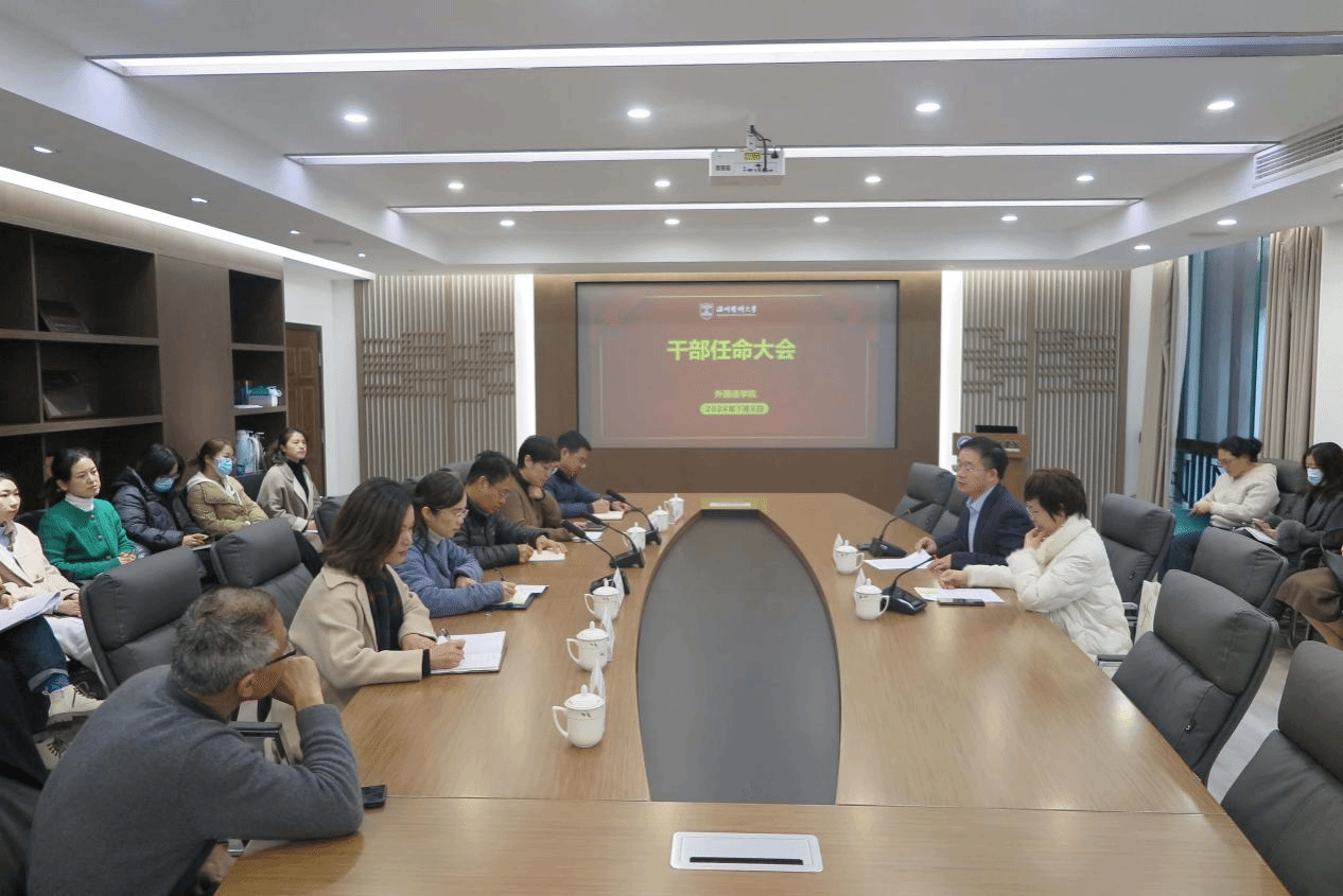 在7B104会议室召开干部任命会议。我校副校长吴文灿、校党委组织部综合科科长王洁,学院新老党政班子成员、组织员,以及学院办公室、系部、教研室负责人参加会议。会议由党委组织部综合科科长王洁主持。