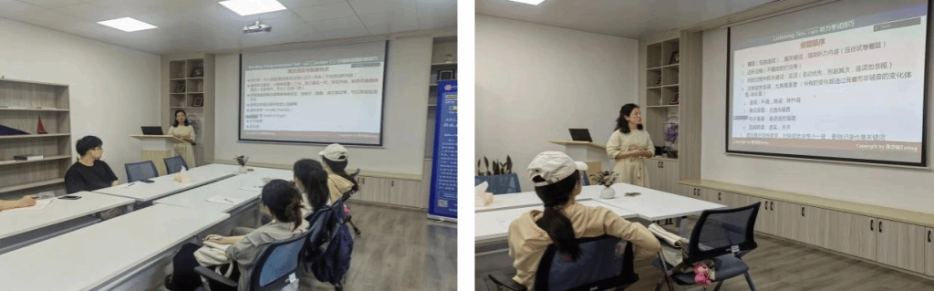 4月29日,第一期帮扶活动在7B102教授工作室展开。活动通过线上和线下两个渠道展开。活动开始前,陈亦挺强调了此次活动的意义,并对四六级考试内容的差异进行对比。活动正式开展后,她从解题技巧和解题目标入手,为同学们介绍了听力、阅读以及翻译写作的解题思路。针对仔细阅读和长篇阅读两个模块,她结合自己多年的教学经验,给学生们传授了解题技巧。