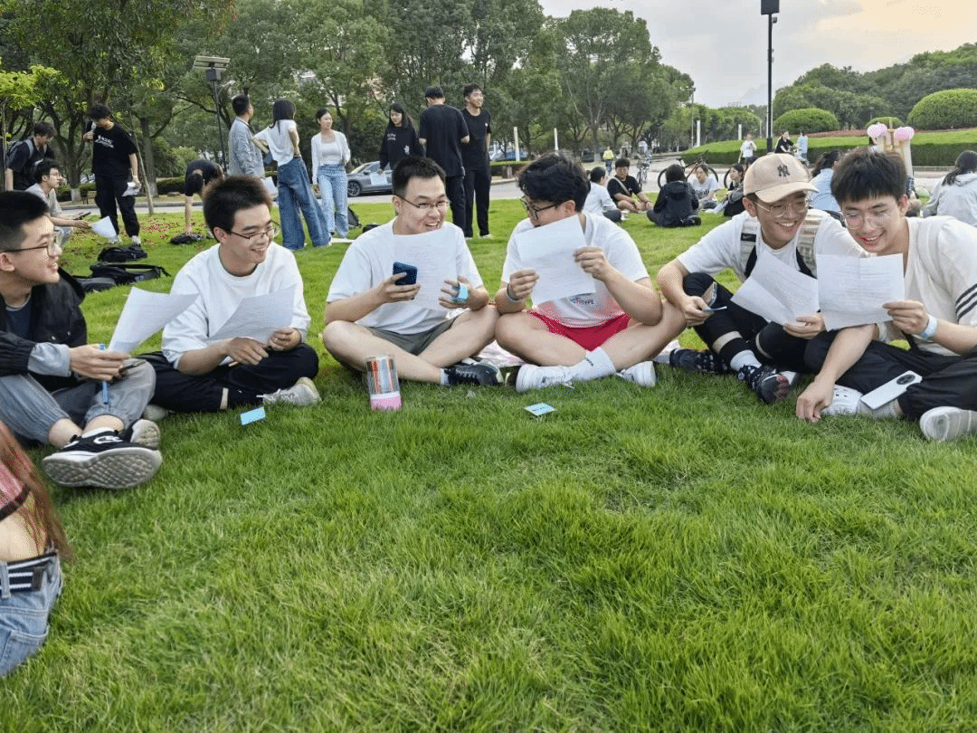 本次活动中,同学们可以在签到时根据自己的喜好选择颜色,并领取对应的英语角特制手环,加入不同的讨论组中。斑斓的色彩错落有致,与碧绿的草坪构成一副独特的图景。