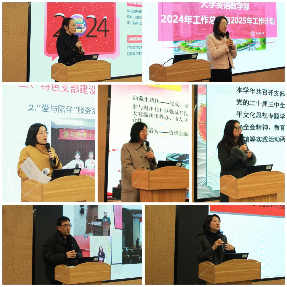 各党支部、系部、工会、妇联依次对本年度工作进行PPT述职汇报。教工第一党支部书记、英语系主任吕颖,第二党支部书记、医学英语教研部主任林甜甜,第三党支部书记、日语系主任陆晓鸣对各支部近一年党建工作,特别是党支部积极推进党建和教育深度融合、加强师德师风建设、开展理论学习与教育、用心用情服务社会等方面进行详细汇报,认真分析不足及原因,提出2025年工作规划,并对系部2024年工作开展情况、特色与亮点、存在问题以及今后工作思路进行了汇报。接着,大学英语教研部主任李文、外语技能拓展部副主任伊迎、院工会副主席郑摄、院妇联副主席方赛繁进行汇报,她们晒成绩、展亮点、提不足,提出了今后工作方向。