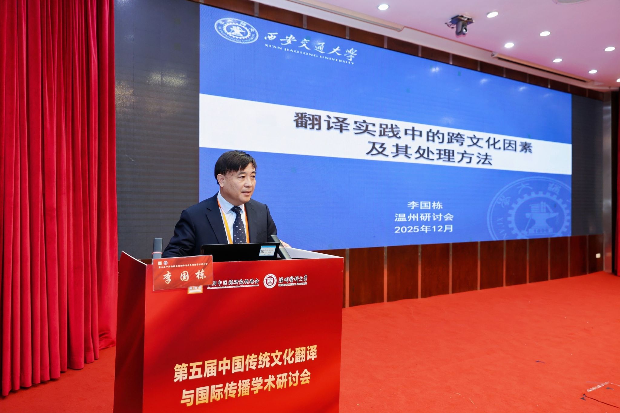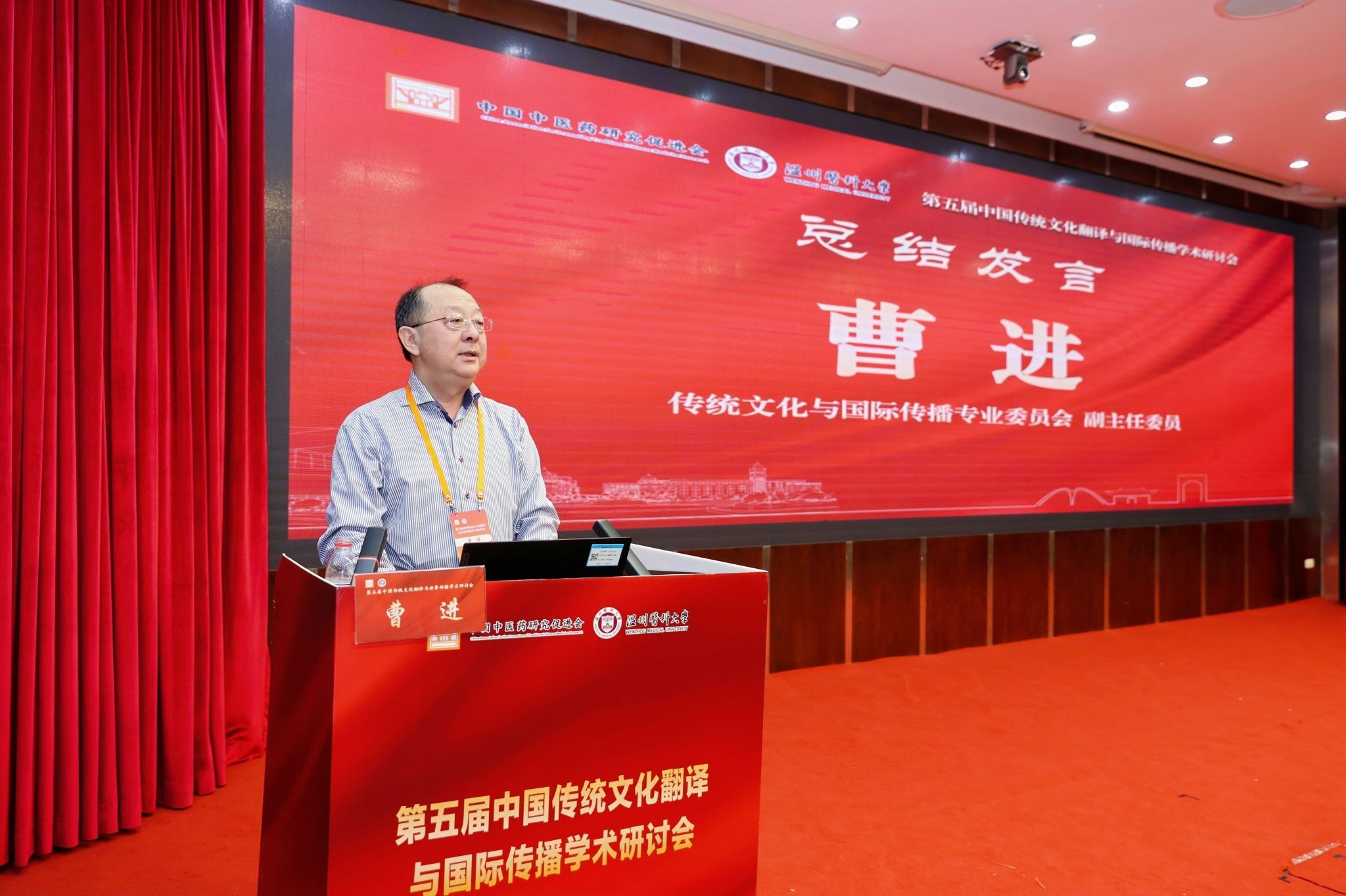 传统文化翻译与国际传播专业委员会主任委员、海南大学赵彦春教授致辞,强调参会者肩负服务国家战略的使命。他分享三点思考:一是立足国家发展形势,指出中医药文化是文化强国建设重要部分,需理清其知识体系,担当传播使命;二是明确中医药文化要踏实研究出精品、做好对外传播、推进国际合作,弥补理论与实践结合不足;三是凸显中医药追求身心愉悦的独特价值,呼吁坚守文化根脉。最后号召大家为国家昌盛、为学会发展壮大携手同行!